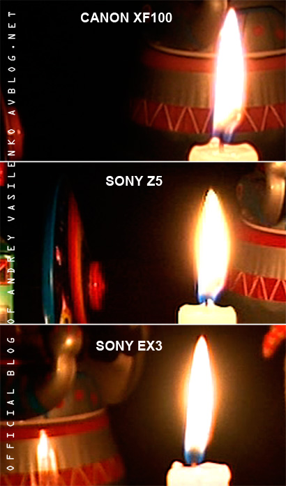 Анализируя представленные кадры, стоит отметить наличие паразитных окантовок черного цвета в верхней части пламени и цветовое “размытие” краев пламени в его центральной области как в случае камеры Sony Z5, так и в случае Sony PMW-EX3. Еще раз хочу отметить, что данные камеры базируются на трехсенсорной системе, а в случае Sony EX3 эта система имеет полноценный формат FULL HD, т.е. 1920х1080 чувствительных элементов на каждом сенсоре, и большую диагональ матрицы — 1/2”. В случае кадров, полученных с обеих камер Sony, у меня, как у режиссера, возникает ряд дополнительных вопросов относительно отсутствия детализации и текстуры самой свечи, фактура воска, к сожалению, отсутствует.