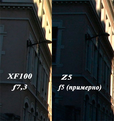 Как можно видеть из представленной иллюстрации, при диафрагме f7.3 камкордер Canon XF100 значительно выигрывает у Sony Z5 как по чувствительности (эквивалентная экспозиция по светам в камкордере Sony Z5 достигается только при большей диафрагме f5), так и по динамическому диапазону, что отчетливо видно по проработке деталей в тенях и светах, а также плавности полутоновых переходов между темными и светлыми областями.