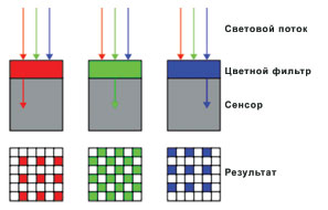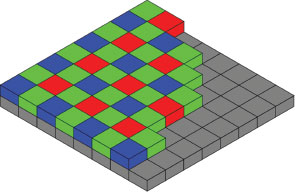 Современные сенсорные блоки цифровых камер обеспечивают разрешение по горизонтали от 1920 пикселей в большинстве трехсенсорных систем и до 4096 пикселей в односенсорных. Но в камерах на базе одного сенсора применяются системы мозаичных фильтров (за исключением HD-сенсора Sony F35), именуемых как “шаблон Байера” (Bayer mask) с наложением цветных фильтров (красного, синего и зеленого) в определенной комбинации на четыре пикселя матрицы (2?2) для формирования одной точки изображения, что обычно приводит к двукратному падению разрешающей способности (см. рисунок).